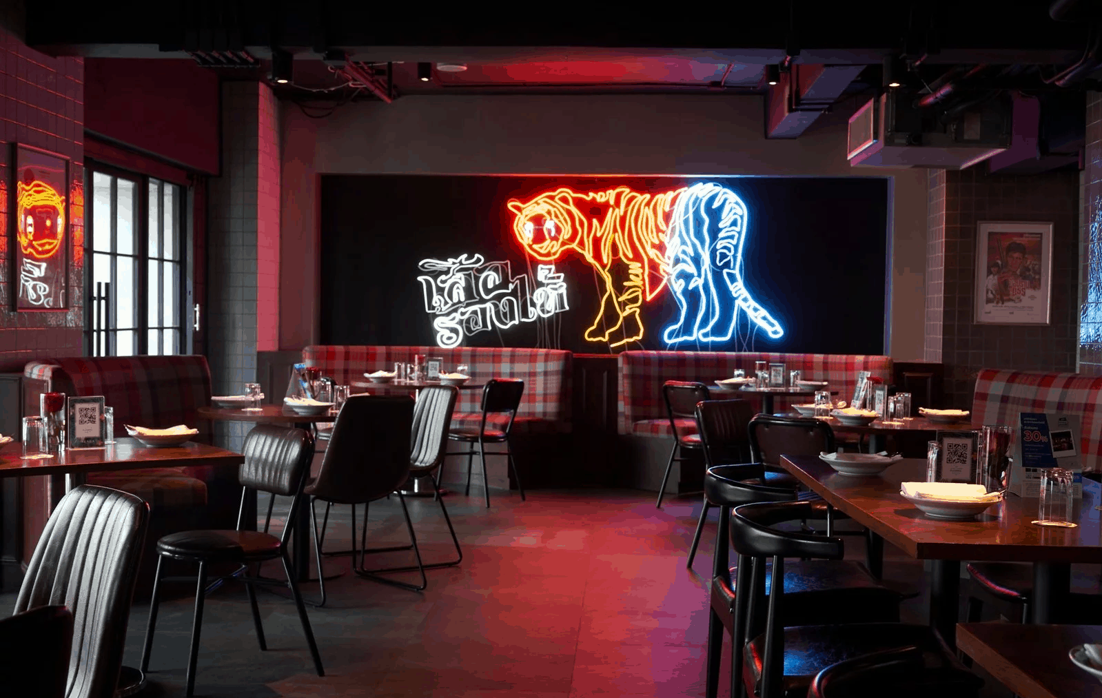 ถัดเข้าไปด้านใน เราจะพบกับแสงไฟนีออนที่พาให้ทุกมุมของร้านมีความเก๋ได้ชวนมองไม่มีเบื่อ รวมไปถึงโซน Chef’s Table ที่เรียกว่า “บาร์รถทัวร์” ด้วยคอนเซปต์การพาลูกค้านั่งรถทัวร์เพื่อเดินทางไปลิ้มลอง และรับฟังเรื่องราวของอาหารไทยแต่ละภาคนั่นเอง